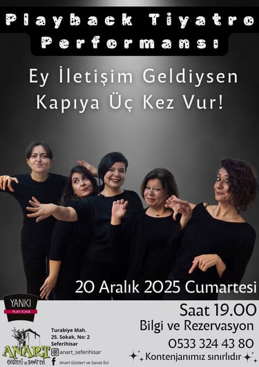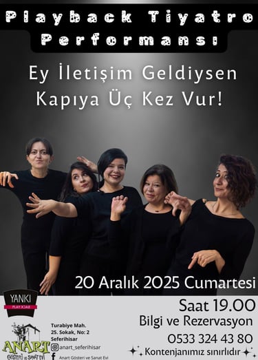 Ey İletişim Geldiysen Kapıya Üç Kez Vur! Yanlış anlamalar, dijital gaflar, İletişim kazaları... Gün boyu konuşuyor, yazıyor, bildirime boğuluyoruz. Peki birbirimizi gerçekten duyuyor muyuz? Öykünü bizimle paylaş; biz de sahnede doğaçlama canlandıralım. Belki bu Kez birbirimizi gerçekten duyarız. Yankı Playback ekibi playback tiyatro alanında ve farklı disiplinlerde çalışmalarını yürüten kolektif bir ekiptir. Yaklaşık on yıldır belediyelerde, sivil toplum kuruluşlarında ve çeşitli mekanlarda playback tiyatro performanslarını sürdürmektedir.